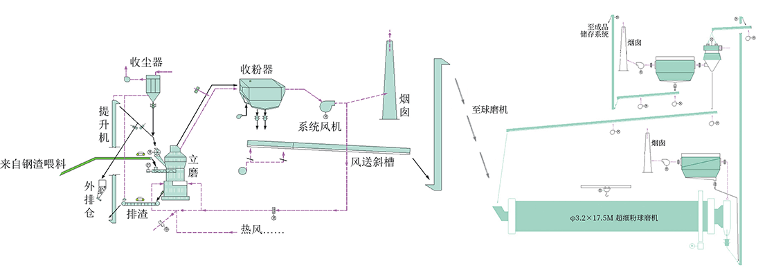 來自立磨系統(tǒng)的鋼渣粉,由提升機輸送至超細(xì)球磨機內(nèi)進(jìn)行粉磨,超細(xì)球磨機出口處配有收塵器對揚塵處收塵;粉磨后物料由提升機送至選粉機進(jìn)行選粉,比表面積≥ 650 ㎡ /kg 的成品超細(xì)粉由收粉器進(jìn)行收集后通過空氣斜槽送至成品提升機入庫;不合格細(xì)粉從選粉機底部出口經(jīng)過空氣斜槽返回超細(xì)球磨機入口,重新進(jìn)入球磨機內(nèi)粉磨,直至粉磨成為合格超細(xì)粉。